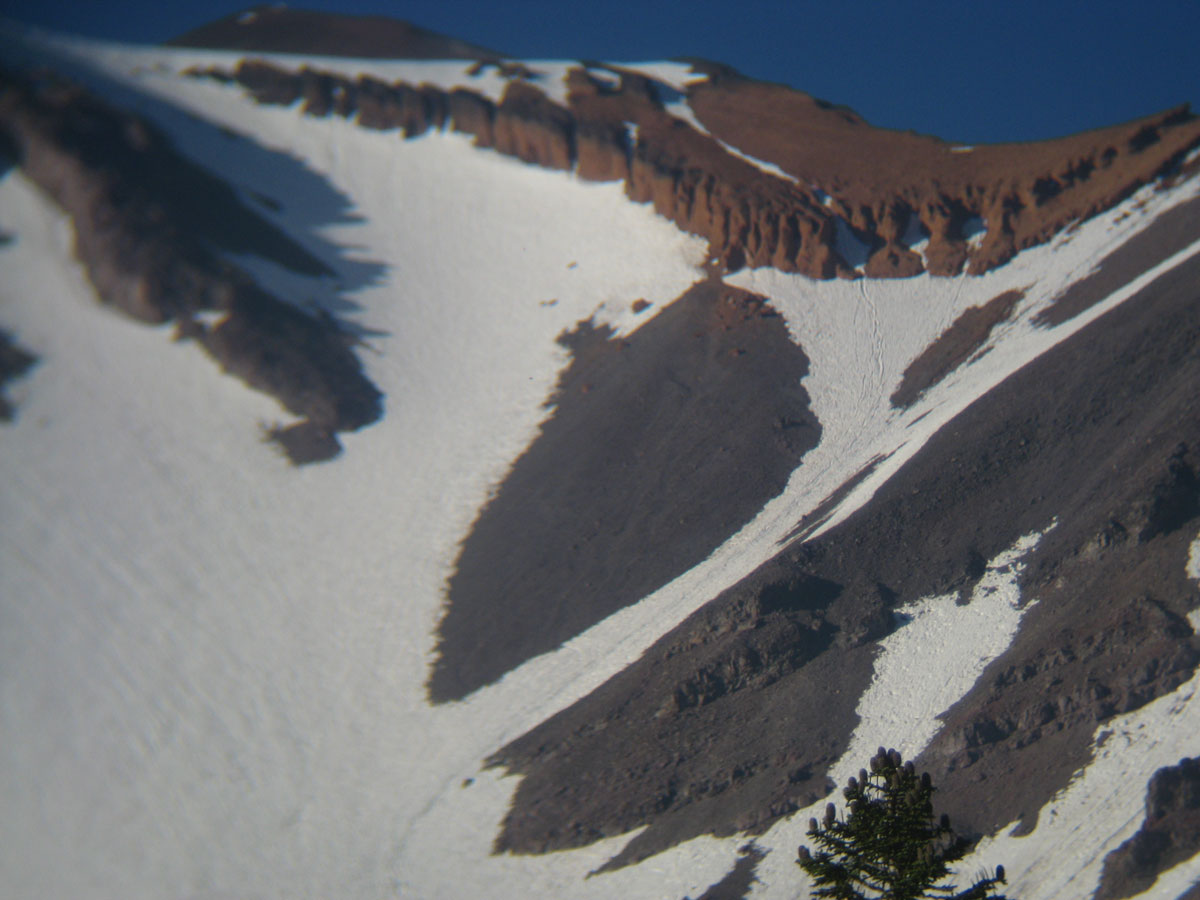 I put my binoculars up to my camera and took this photo of the upper portion of the route. You can see the tracks in the snow and the path through the cliff band (called the Red Banks).