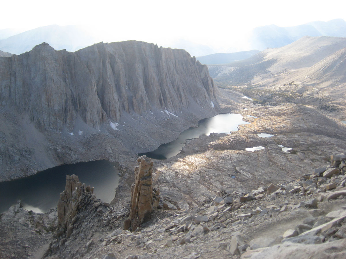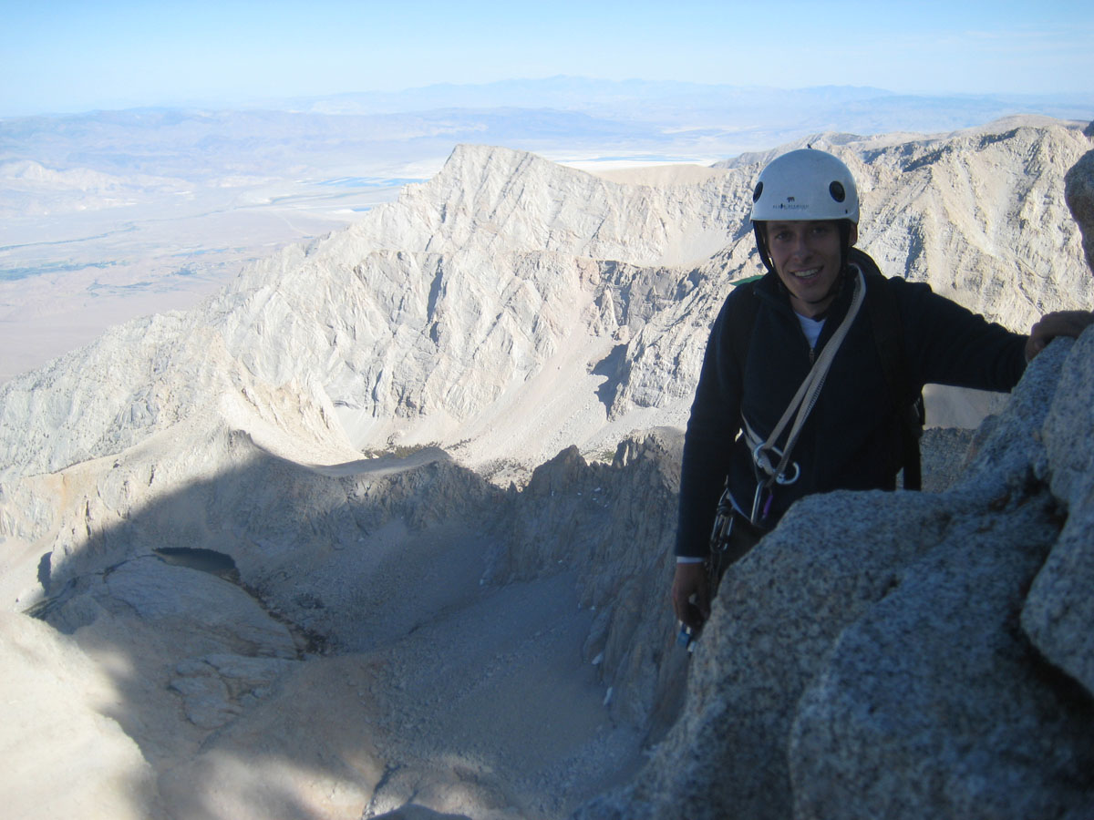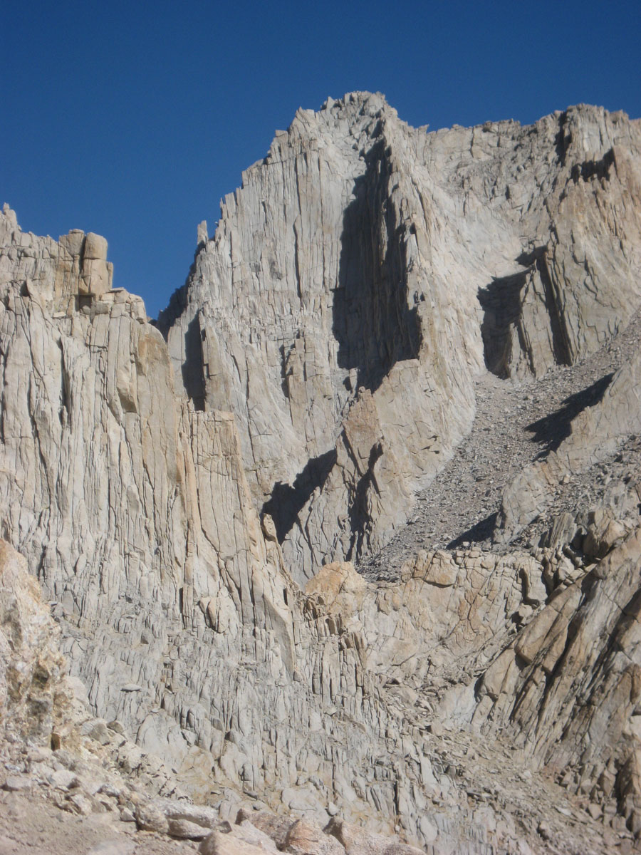 Mt. Russell, the 7th tallest mountain in California. It’s famous Fishhook Arete climb can be seen coming straight down from the summit.
