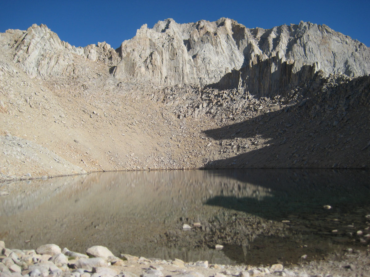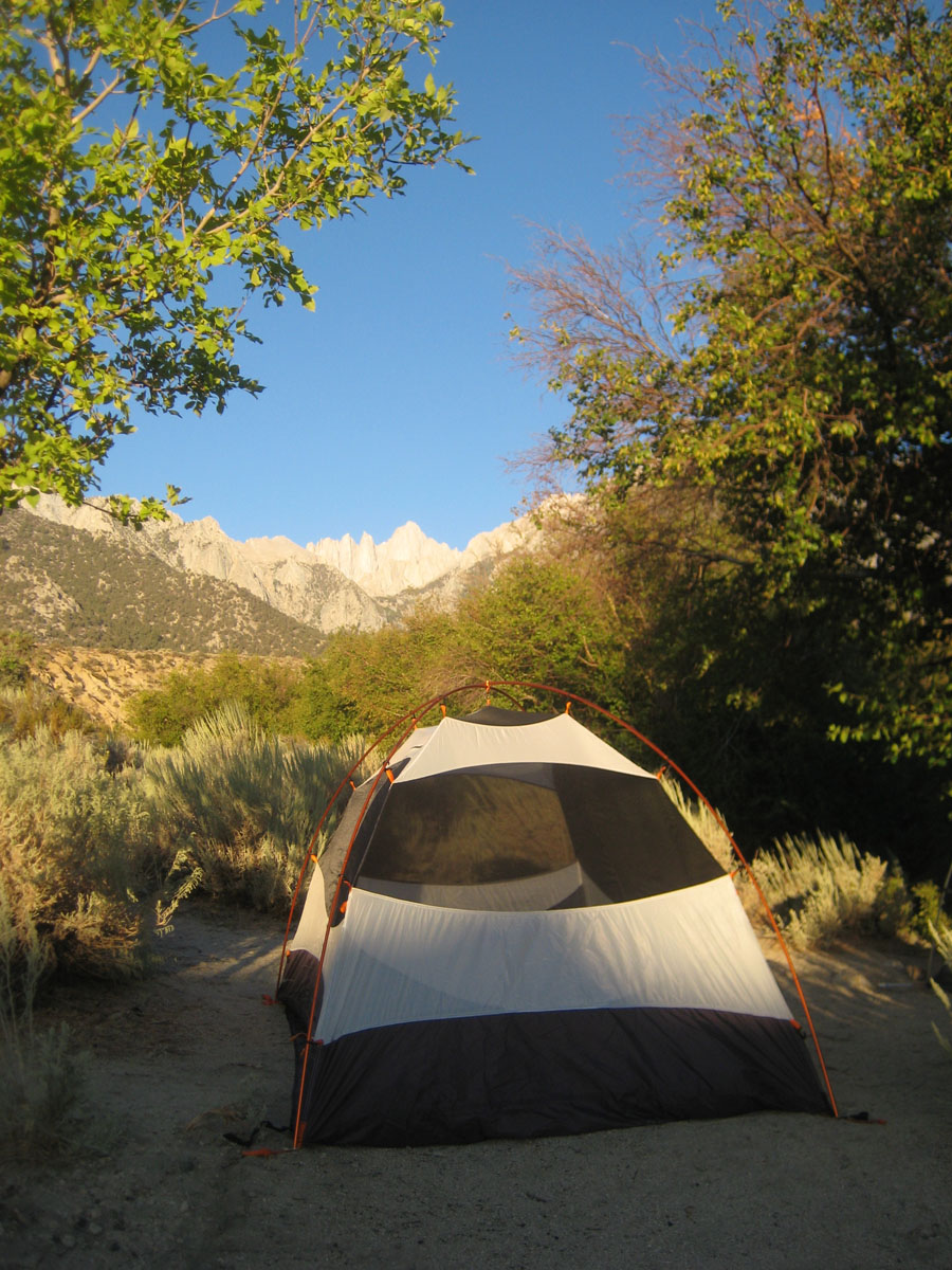 We camped that night in a campground between Lone Pine and Mt. Whitney. The next day was a prep day, which we spent hiking around Whitney Portal and doing some rock climbing at the Alabama Hills (though we didn’t climb much because it was 100+ degrees). The plan for the next day was to get up super early, hike up to the east side of Mt. Whitney, and climb the Mountaineers Route, a 3rd class scramble up a gully on the east face. Jonny really wanted to do the famous East Face route (5.7, 1,000′; it is one of the well-known 50 Classic Climbs of North America) but since this would be my first time higher than 11,000 feet, I didn’t feel comfortable doing a rock climb. I just wanted to get to the top of the thing and didn’t care how I did it. But Jonny talked me into it, so we racked up, packed our bags, and went to sleep early.