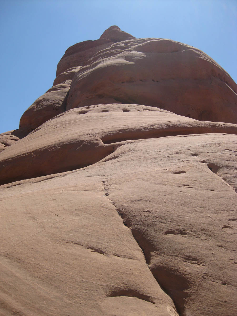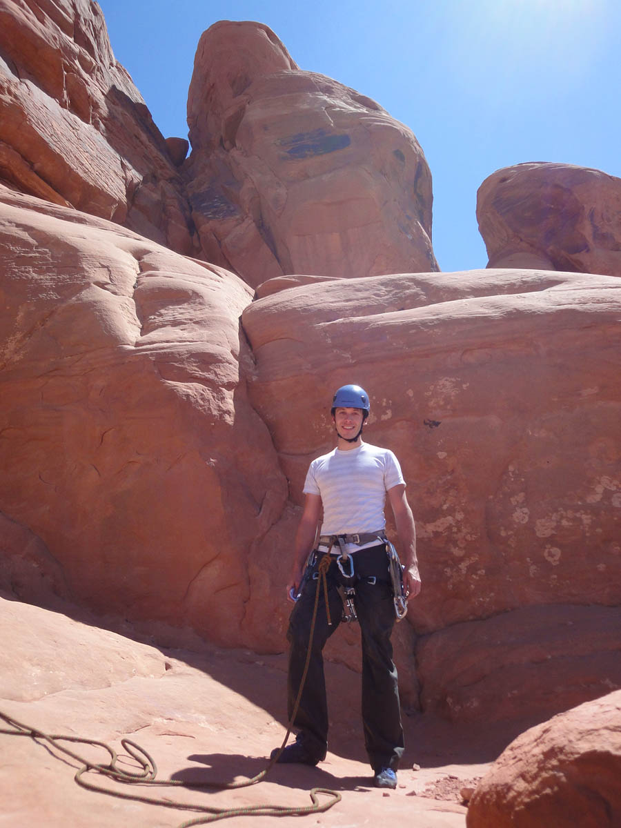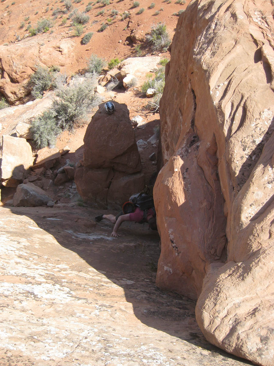 I think my ascent with Sam might have been the second ascent of the route. I led all the pitches. The route is sandy, but so is everything else in Arches. There are no fixed anchors for belays, so you can’t bail from the route.
