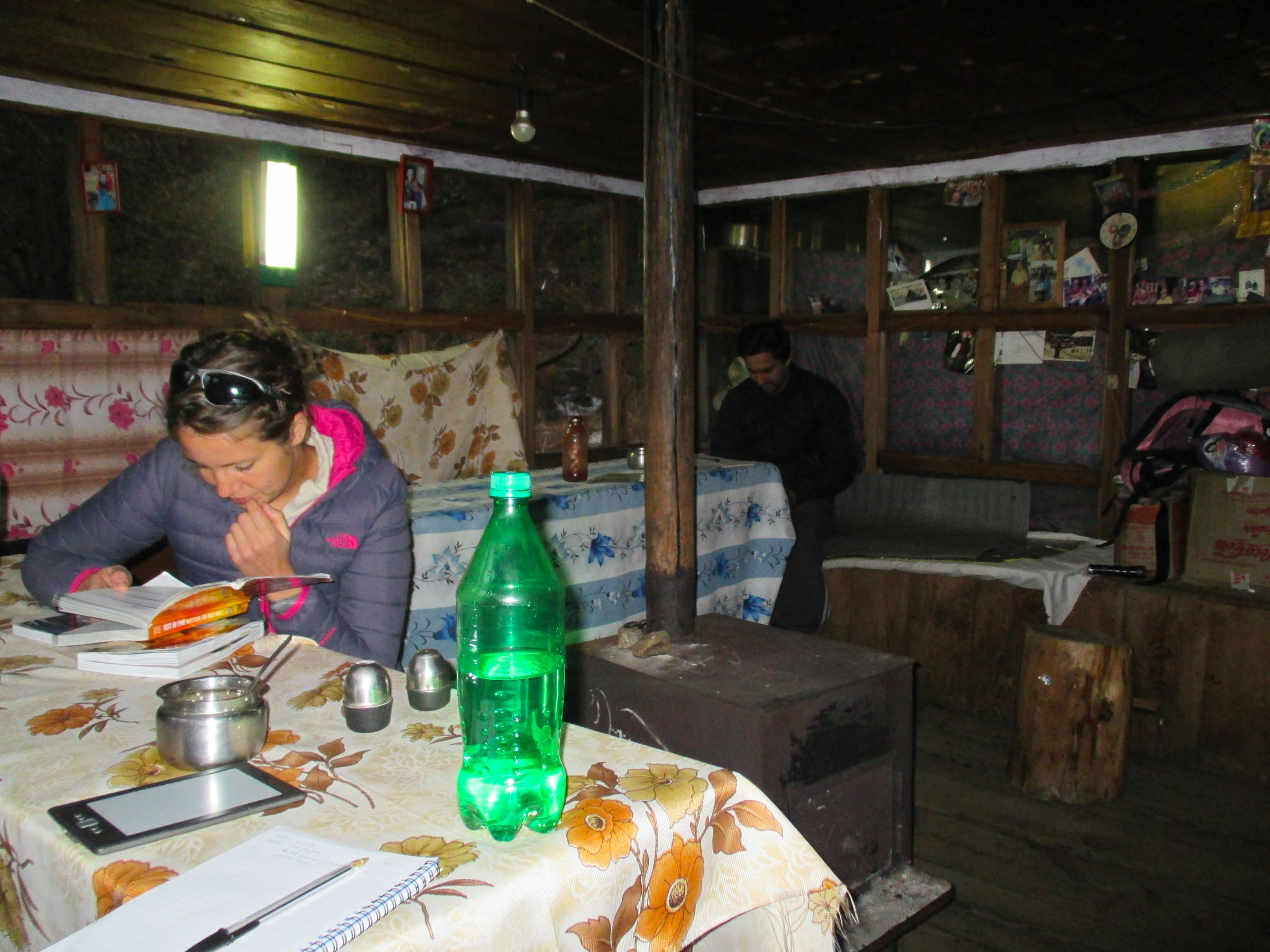 Jo and Sanjay relaxing in the communal dining area at our guesthouse in Gumnachowk.