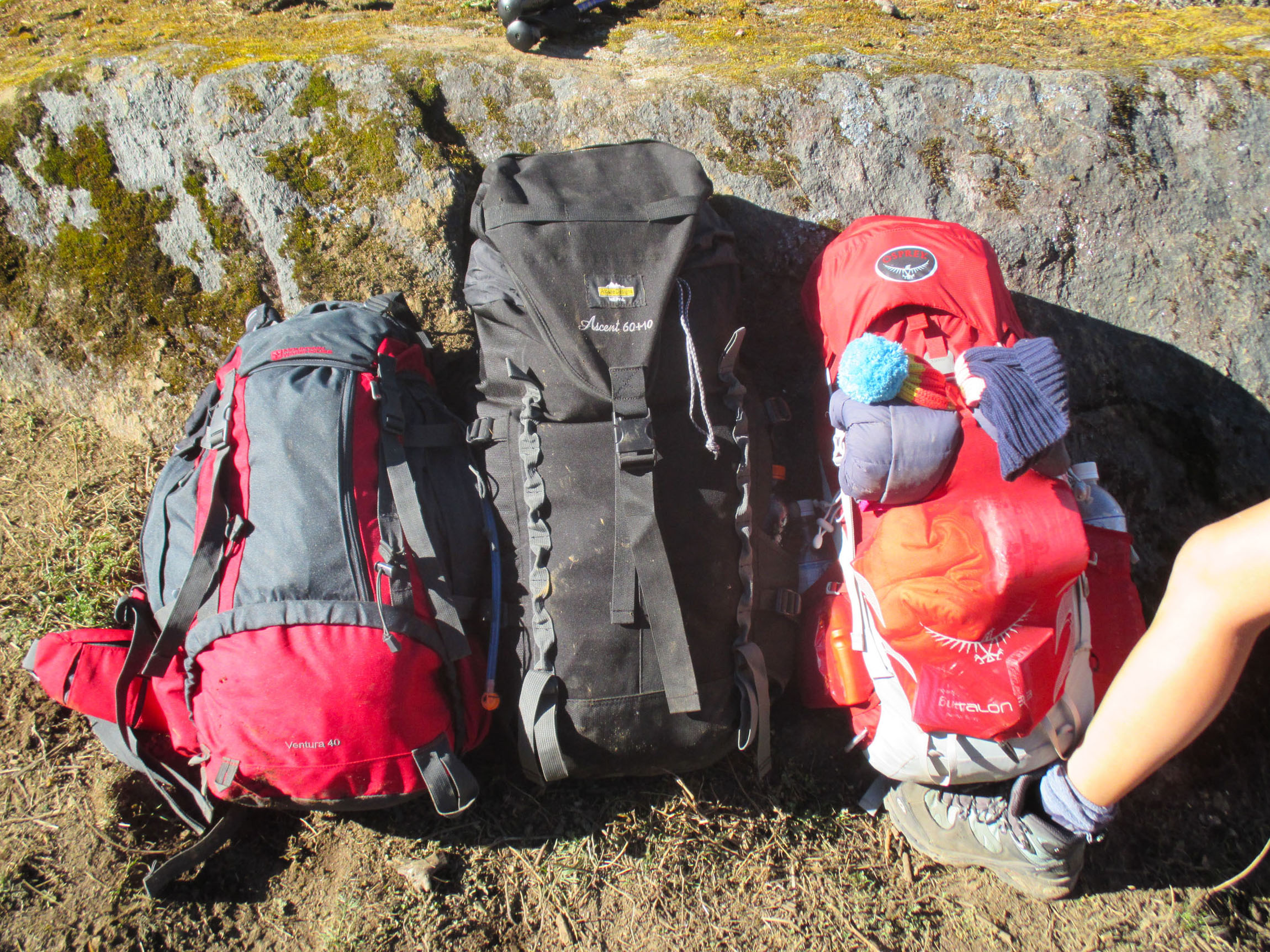 Sally’s pack, my pack, Jo’s pack. (Remember that I’m carrying a fair amount of Sally’s stuff here.) Jo’s leg for scale.