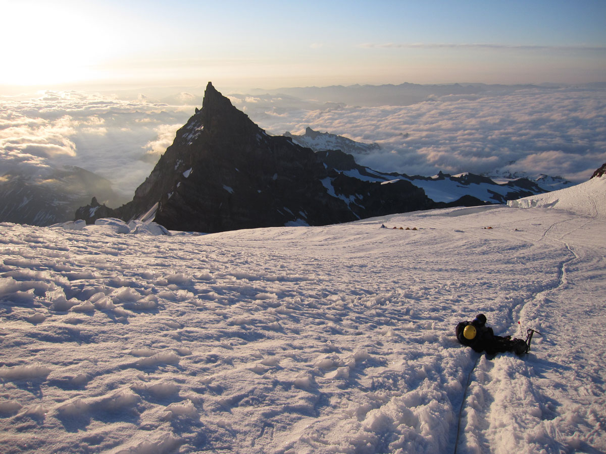 When we were climbing Rainier, he had to sit down and rest every few hundred feet. The altitude was getting to him and his rented plastic mountaineering boots were rubbing his heels raw. It was rough. After he’d been resting for a few minutes, I’d tug on the rope to wake him up and get him moving again. He’d then get up and keep going until he had to sit and rest again. It was during those rests that I took the above photo.
