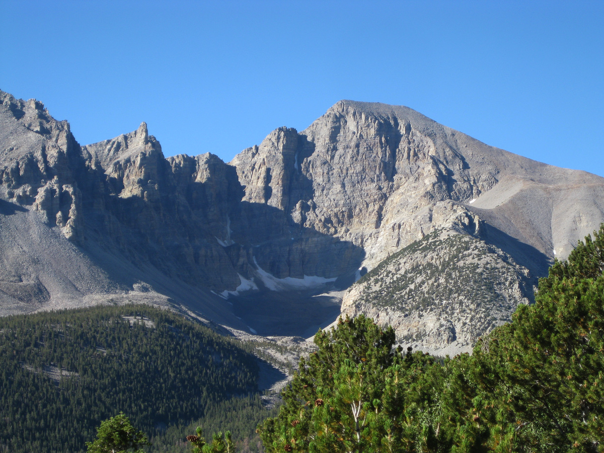 But yeah, the trail eventually led me to the base of the northeast face and the only “glacier” in Nevada. I say “glacier” because it’s not really a glacier but more of a perpetual snowfield. There are no crevasses in it or anything. Still it was fun to see snow in the Nevada desert on early September. Wheeler’s northeast face is big and terrifying and I desperately want to climb it. The only problem is that officially, there are no bolts allowed in the area (which is part of Great Basin National Park, by the way) and especially no power drills. Climbing that huge face (which is larger than Half Dome and with much worse rock) without bolts is a very, very, very scary and incredibly alluring prospect. I’ve been invited a couple times on various attempts on the face, none of which have been successful.